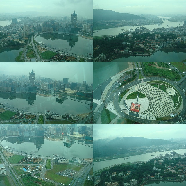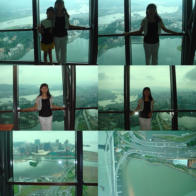 將近11點半時~我們來到澳門最高的觀光塔~樓層有62~我們乘坐直達電梯到58層的觀景樓~走在透明的玻璃上~心理稍微涼了一下~因為腳底是玻璃,而底下都是空的~如果有懼高症的人一定不太敢踏在上頭~